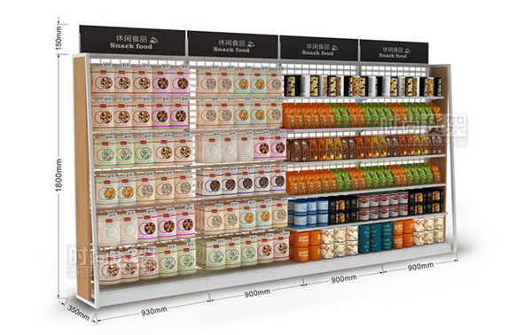 上圖所示是應用于便利店食品區(qū)域的單面食品貨架。便利店單面食品貨架采用了通透性更強的網背板設計,再搭配上簡約時尚的木質側板,整體散發(fā)出一種小清新的氣息,營造出新時代便利店精致、高端的店鋪形象。