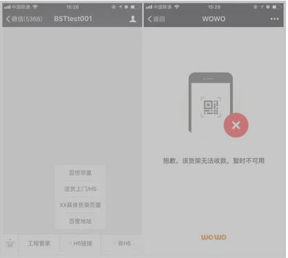 億邦動力網隨后查看了百世店加、百世鄰里等官方微信號,均未找到“貨架”入口,但卻在百世店加旗下的另一個公眾號“BSTtest”中發(fā)現(xiàn)了一點“痕跡”。該公眾號中設有入口“XX具體貨架頁面”,點擊進入后,頁面顯示“貨架暫時無法收款”,而頁面中出現(xiàn)的“WOWO”字樣也疑似貨架的落地地點——百世集團在去年收購的WOWO便利店。