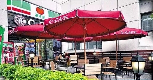 在便利店的店門外,撐幾把帶有品牌logo的遮陽傘,再擺幾把藤桌藤椅,一個既可以裝飾門店外觀,又易于清潔移動的室外休閑區(qū)就打造完成。非常適合店面不大卻又需要休閑區(qū)的便利店。