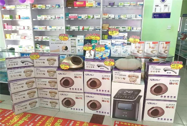堆頭陳列較為簡單,多是將大型器械的外盒整齊的堆砌起來,擺放在藥店里合適的位置。