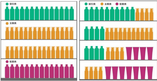 將主推商品擺在超市貨架黃金位,吸引類和配套類商品分別擺在貨架上部分和下部分的位置(圖左示)。當(dāng)然也可以更靈活地將吸引、主推和配套商品穿插擺放(圖右示)。