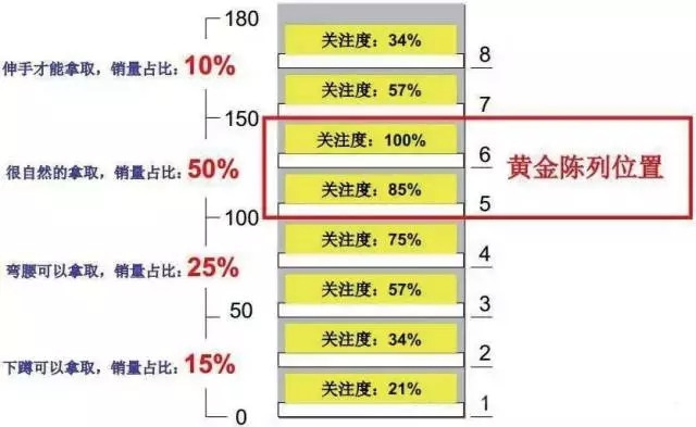 作為超市的經(jīng)營者,一定要知道超市貨架的“黃金陳列位置”:亞洲人的普遍身高在160-170cm,所以顧客的視線范圍大多集中在100-150cm的范圍內(nèi),也就是貨架上第3和第4層,把人氣商品放置在這里更容易優(yōu)先讓顧客發(fā)現(xiàn)。