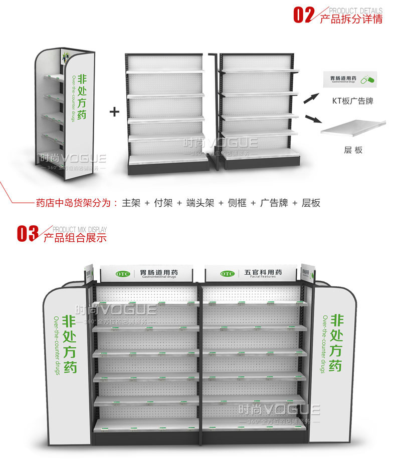 - 產(chǎn)品描述:此款藥店貨架是深圳時(shí)尚貨架專為連鎖藥店打造的一款開(kāi)放式非處方藥貨架。