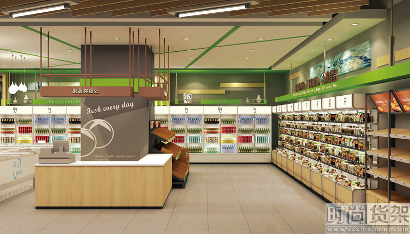 下面【時尚貨架】小編就介紹以下,時尚貨架為社區(qū)便利超市設計的一整套陳列方案。包含:商品陳列區(qū)、果蔬區(qū)、休閑區(qū)、收銀區(qū)。