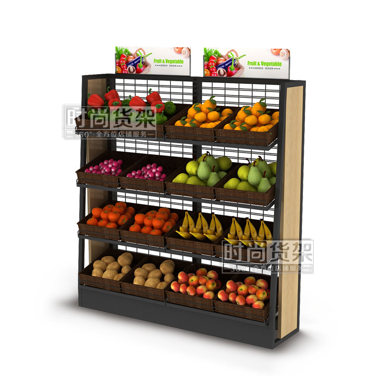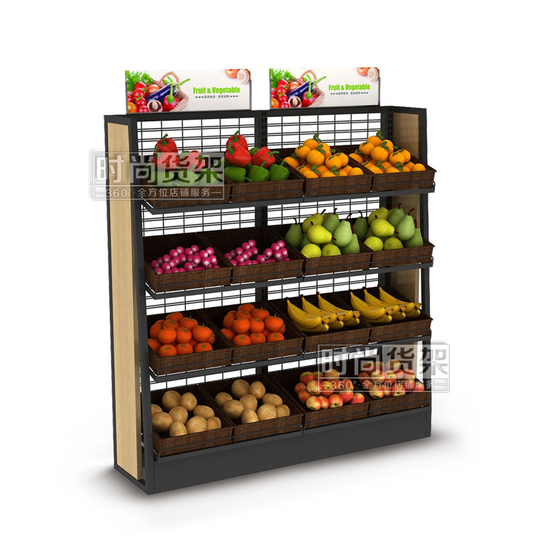 【描述】采用優(yōu)質(zhì)鋼立柱,網(wǎng)狀背板,可有效節(jié)省成本 ;層板可調(diào)節(jié)設(shè)計(jì),可根據(jù)果蔬的重量和數(shù)量來調(diào)節(jié)貨架的層數(shù);層板上可以搭配棕色的藤框,凸顯自然美觀,可有效區(qū)分果蔬種類,方便顧客選購(gòu)。