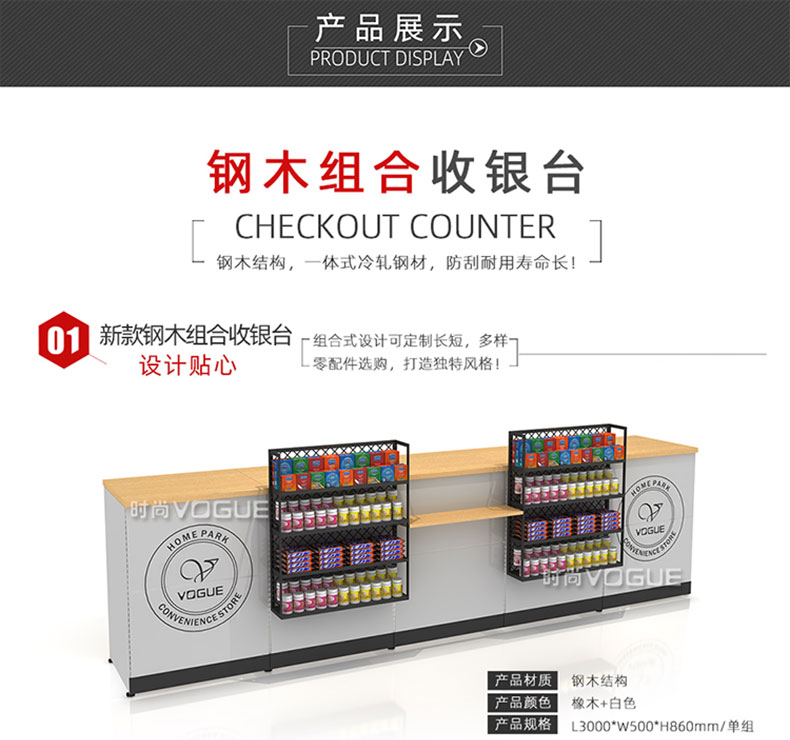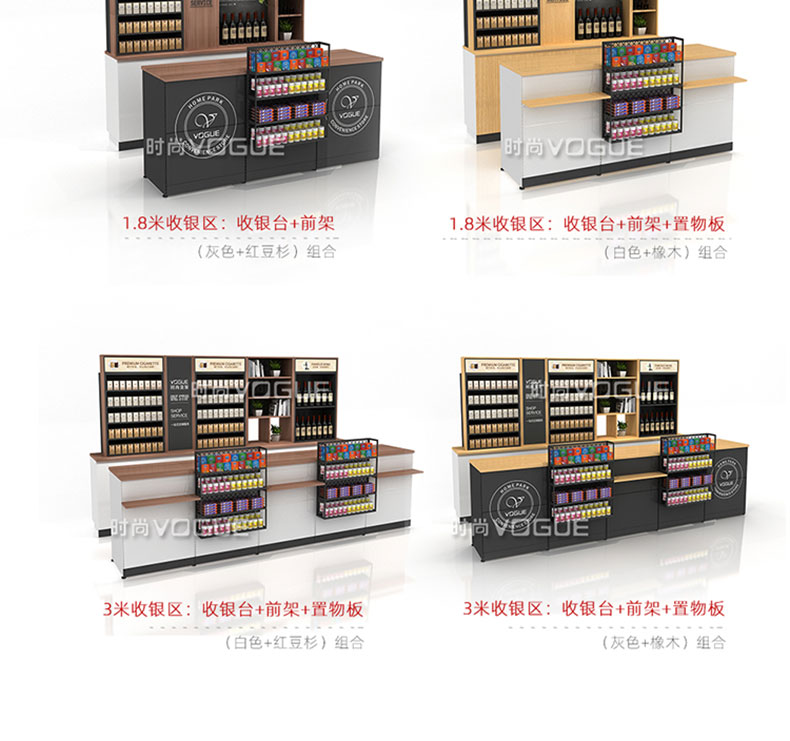 【特點(diǎn)】組合形式,滿足不同收銀區(qū)需求;精選材質(zhì)使用壽命長(zhǎng);擴(kuò)展側(cè)面空間增強(qiáng)收銀臺(tái)功能