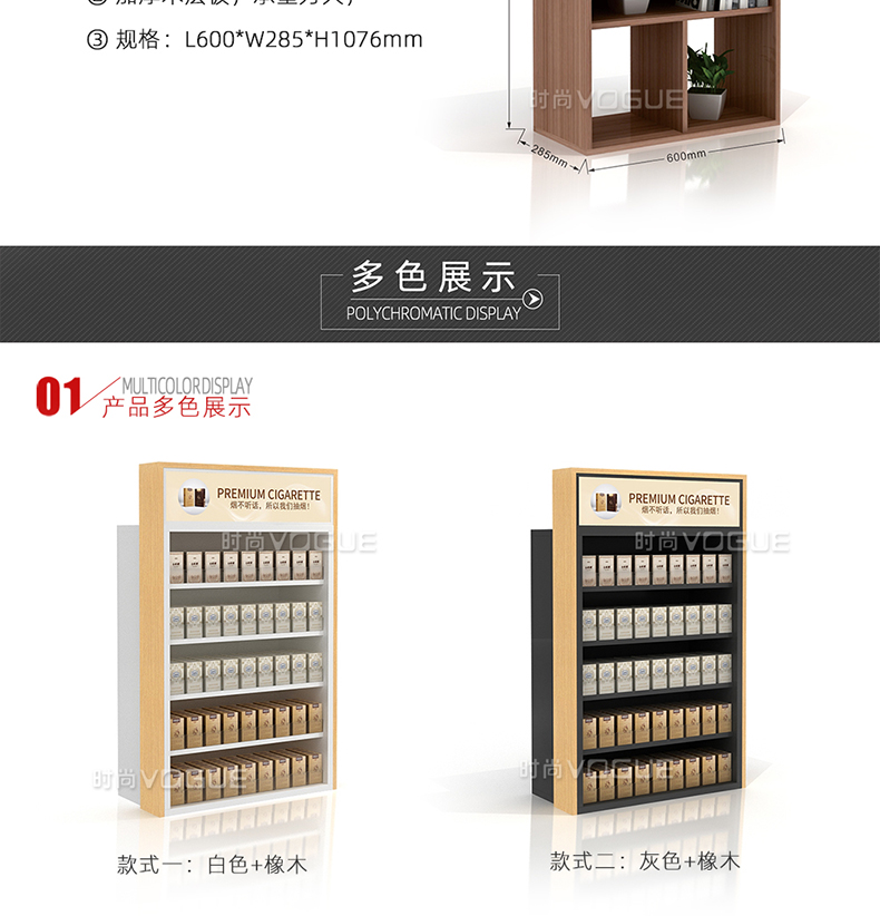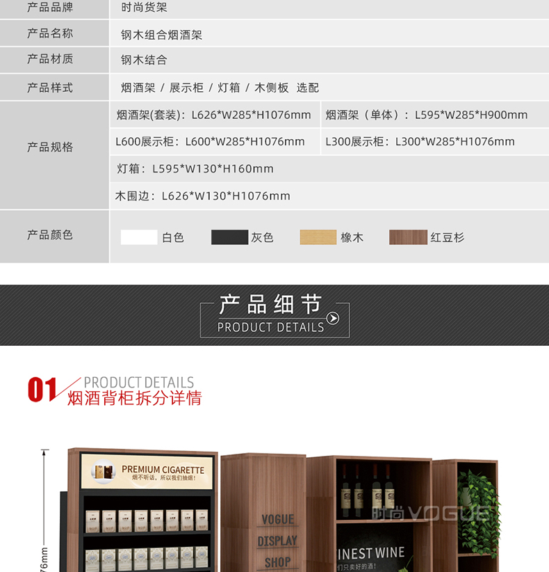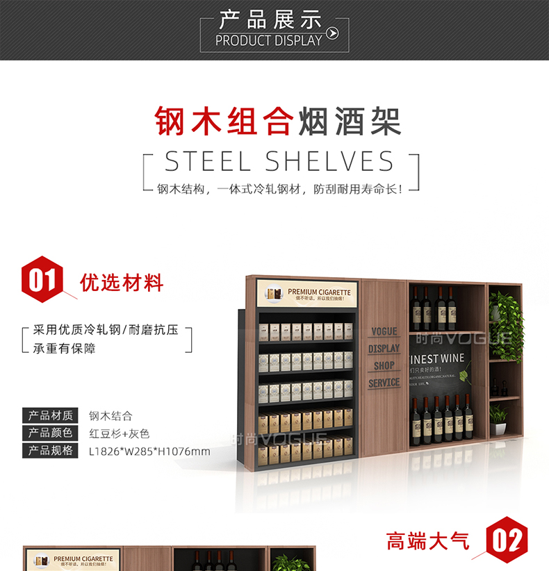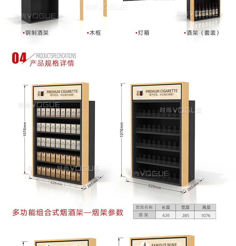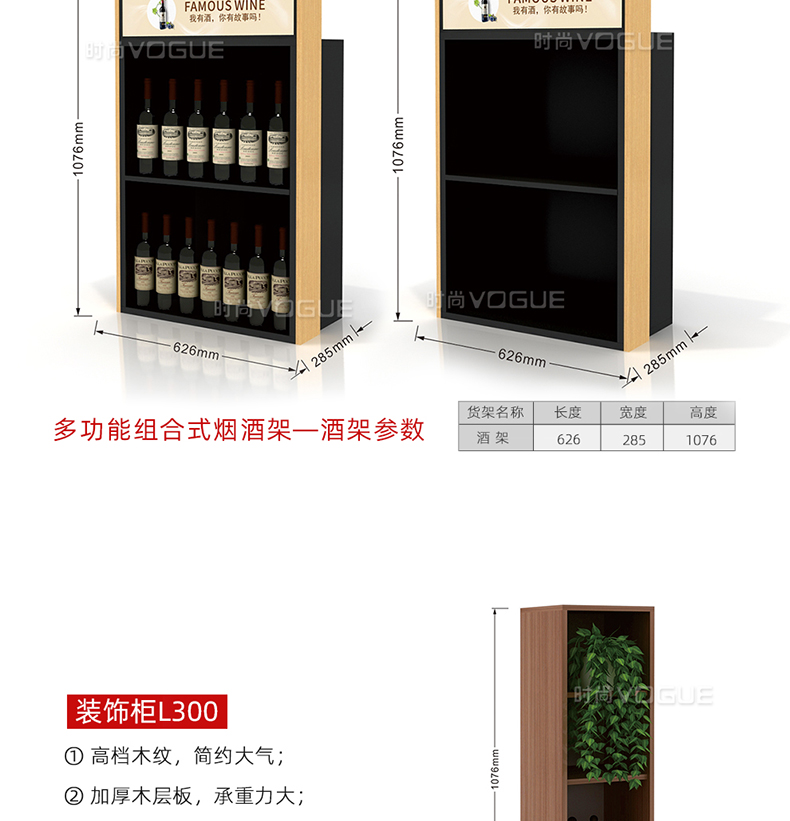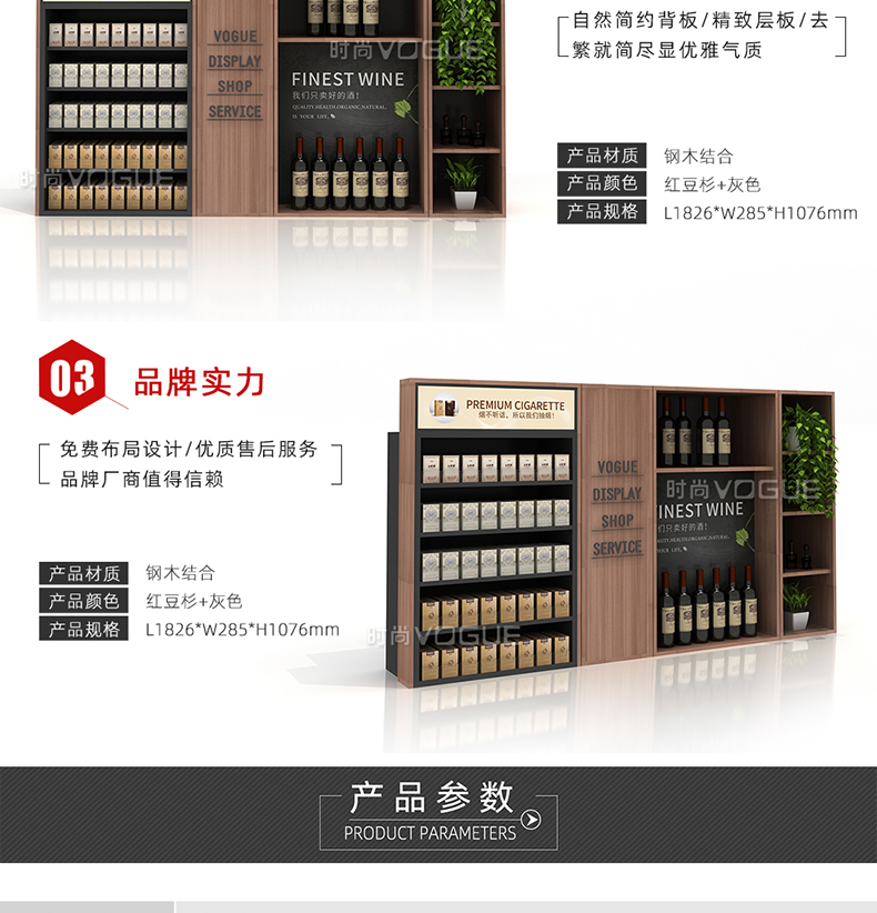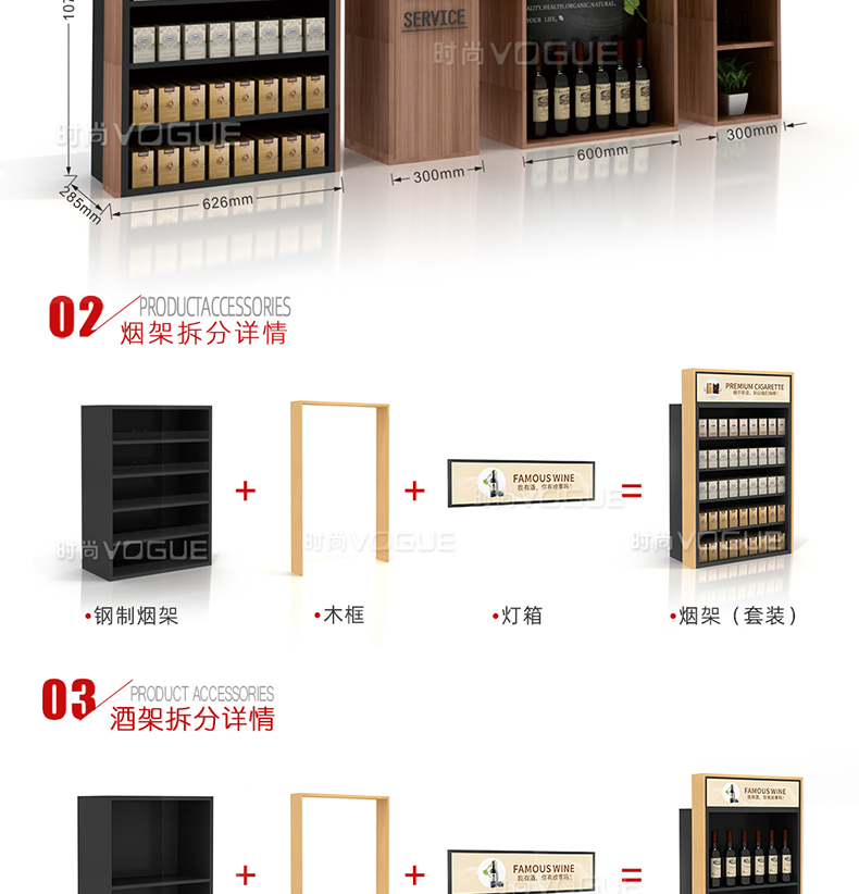 【描述】此款便利店貨架是時尚貨架為便利店收銀區(qū)設(shè)計的而一款收銀臺煙酒架。它由便利店煙架、便利店白酒架、收銀臺紅酒架組合而成。便利店煙酒架立柱采用優(yōu)質(zhì)鋼材,具有很好的承重能力。頂部配有磁吸燈箱廣告牌,即可宣傳品牌,又可以指引顧客,讓整個收銀區(qū)的工作效率顯著提高。此款收銀區(qū)煙酒架是框架式結(jié)構(gòu),可以直接放置在收銀背柜上,穩(wěn)定性和安全性很好。