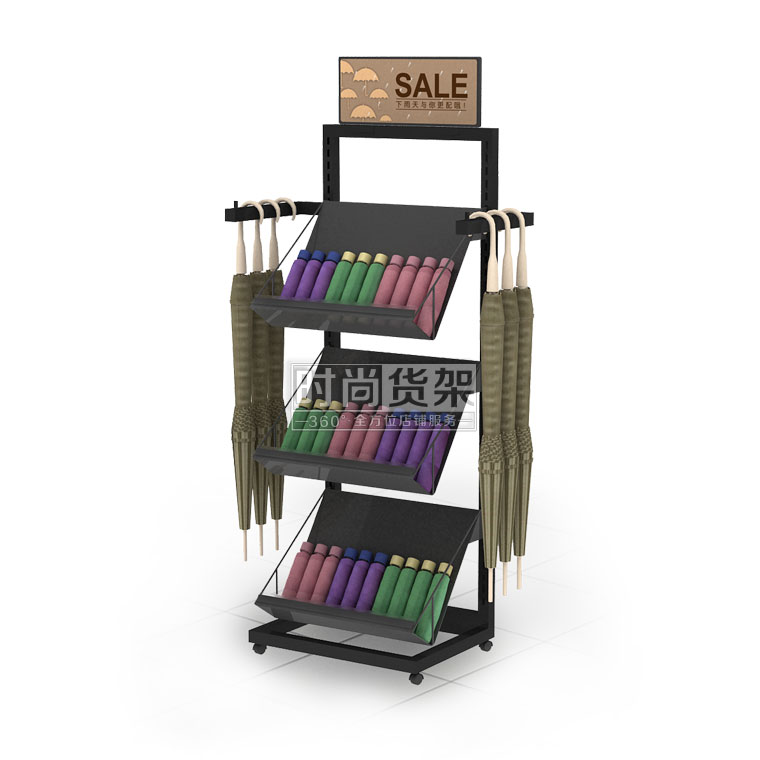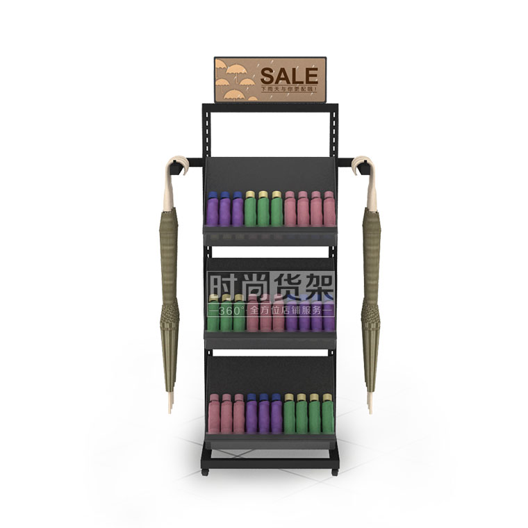 【描述】啞光的深灰色設(shè)計(jì),讓外觀更顯現(xiàn)代時(shí)尚;采用優(yōu)質(zhì)冷軋鋼,真材實(shí)料,加粗立柱,結(jié)構(gòu)穩(wěn)固,不易刮蹭掉色,歷久如新;帶有傾斜角度的層板,三面均設(shè)計(jì)了護(hù)欄,有效防止商品的散落,同時(shí)這樣的傾斜角度,更符合消費(fèi)者的購(gòu)物視角,充分展示不同雨傘的大小、樣子;卡扣式的層板便于調(diào)整高度,輕巧易于安裝擺放